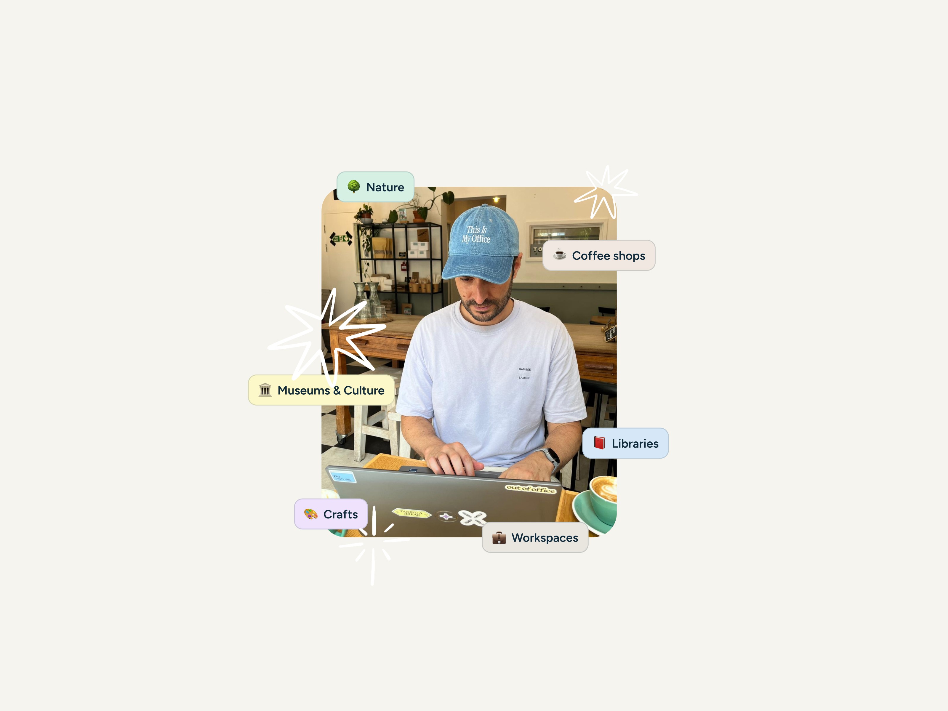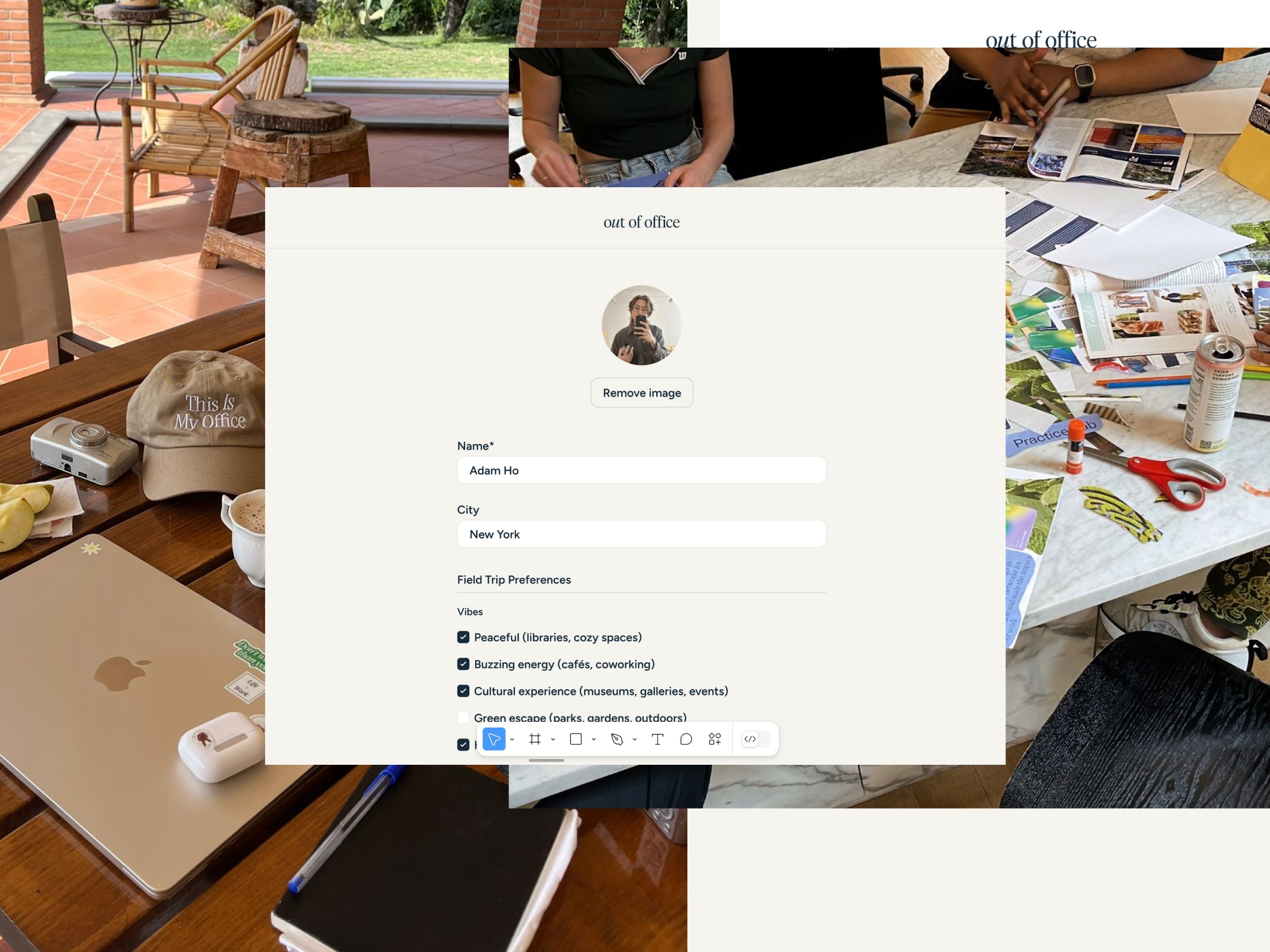 Out of Office is a place to reimagine how we live and work in a modern world. Through a socio-technical infrastructure, we're building a network that supports inspiration and connection. Currently testing ✨